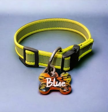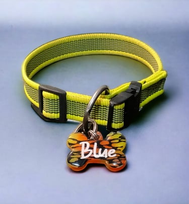 Plaquitas de identificación para nuestros amigos/as de cuatro patas. Bonitas y originales, estas chapitas para perros van diseñadas con su nombre delante y tu número de teléfono en el reverso.